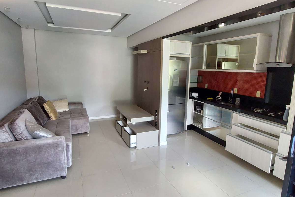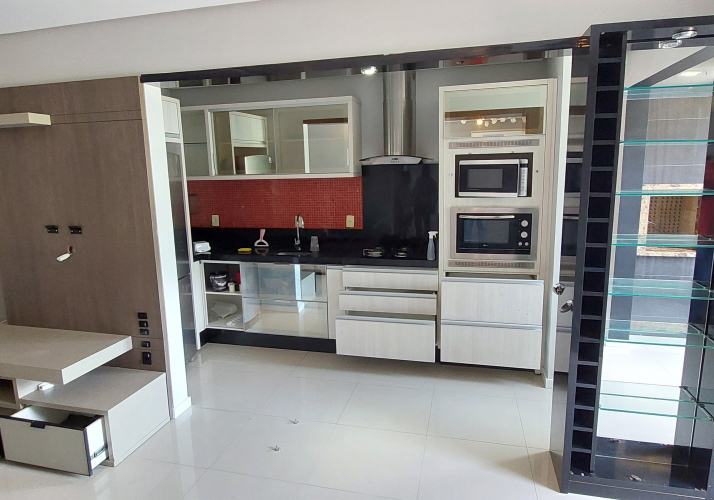 Sala de jantar e estar integradas com a cozinha e a sacada, criando um ambiente espaçoso e aconchegante;